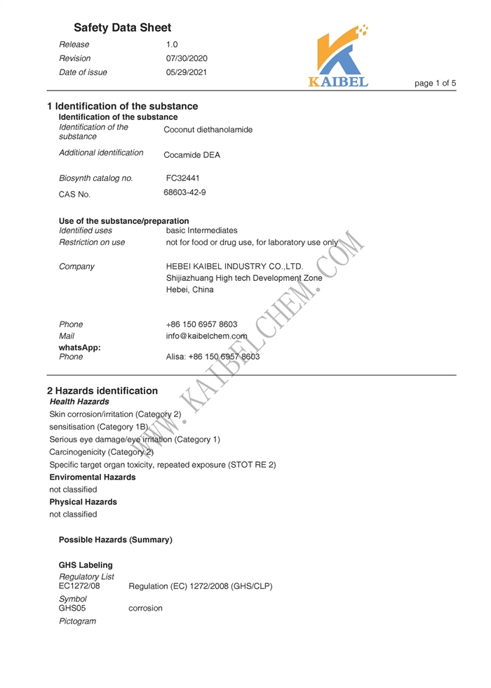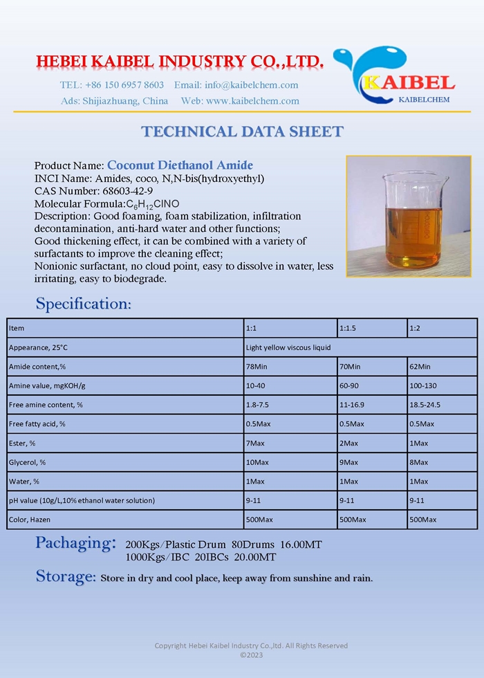 CDEA (6501) is an amide of coconut fatty acid. It is water soluble. It has good wetting, cleaning, dispersing, resistance to hard water and antistatic performances. Especially, it has perfect thickening, foaming, foam-stablizing and derusting abilities. Compounded with other anionic surfactants, such as LAS, the foaming ability will be obviously improved, and foam is more affluent, stable and long standing. Washing effect is also enhanced.