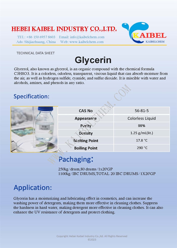Glycerol, also known as glycerol, is an organic compound with a chemical formula of C3H8O3, a colorless, odorless, transparent viscous liquid, mainly used in food processing, cosmetics, pharmaceuticals, cleaning agents and other industries. It has good antibacterial, antioxidant and heat resistance.