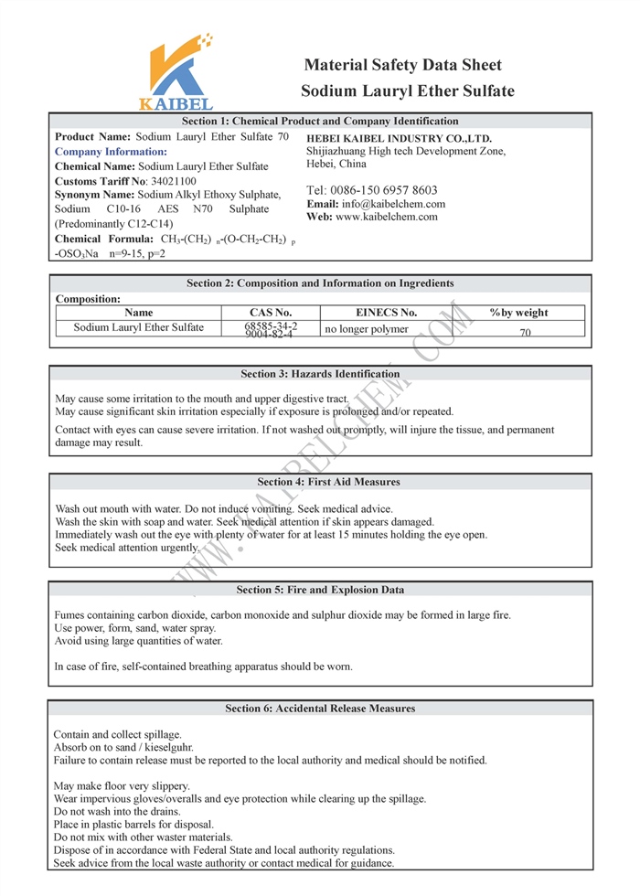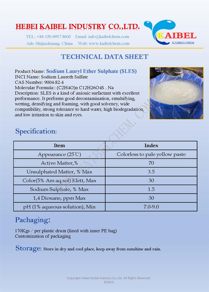 Sodium Lauryl Ether Sulfate (SLES 70%) is a kind of anionic surfactant with excellent performance. It has good cleaning, emulsifying, wetting and foaming properties. It easily dissolves in water, compatible with many surfactants, and stable in hard water. It is biodegradable with low irritation to skin and eye.